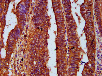 • IHC image of CSB-PA883646LA01HU diluted at 1:500 and staining in paraffin-embedded human colon cancer performed on a Leica BondTM system. After dewaxing and hydration, antigen retrieval was mediated by high pressure in a citrate buffer (pH 6.0). Section was blocked with 10% normal goat serum 30min at RT. Then primary antibody (1% BSA) was incubated at 4°C overnight. The primary is detected by a biotinylated secondary antibody and visualized using an HRP conjugated SP system.