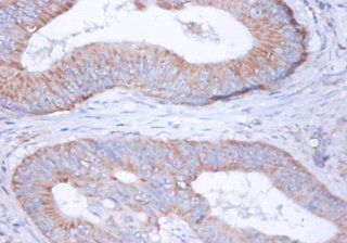 Immunohistochemistry of paraffin-embedded human colon cancer using CSB-PA04645A0Rb at dilution of 1:100