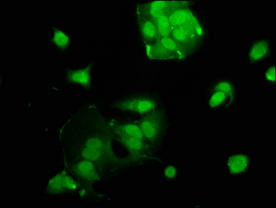 Immunofluorescence staining of MCF-7 cells with CSB-PA621888LA01HU at 1:100, counter-stained with DAPI. The cells were fixed in 4% formaldehyde, permeabilized using 0.2% Triton X-100 and blocked in 10% normal Goat Serum. The cells were then incubated with the antibody overnight at 4°C. The secondary antibody was Alexa Fluor 488-congugated AffiniPure Goat Anti-Rabbit IgG(H+L).