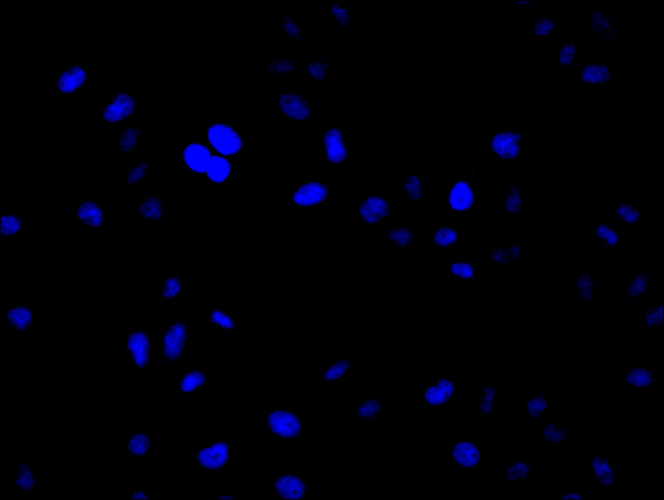 Immunofluorescence staining of Hela cell with CSB-PA025796OA01HU at 1:30, counter-stained with DAPI. The cells were fixed in 4% formaldehyde and blocked in 10% normal Goat Serum. The cells were then incubated with the antibody overnight at 4C. The secondary antibody was Alexa Fluor 488-congugated AffiniPure Goat Anti-Rabbit IgG(H+L).