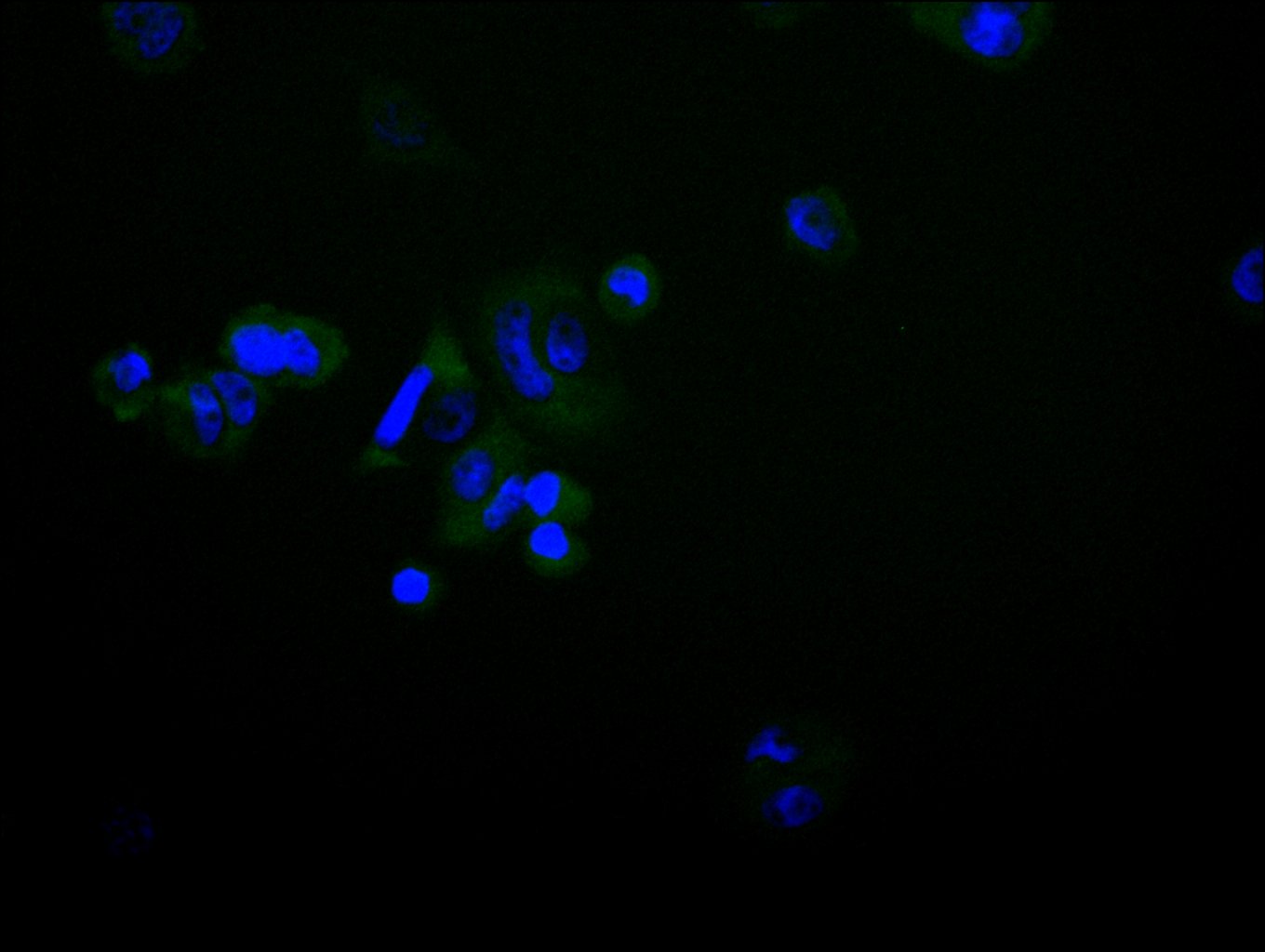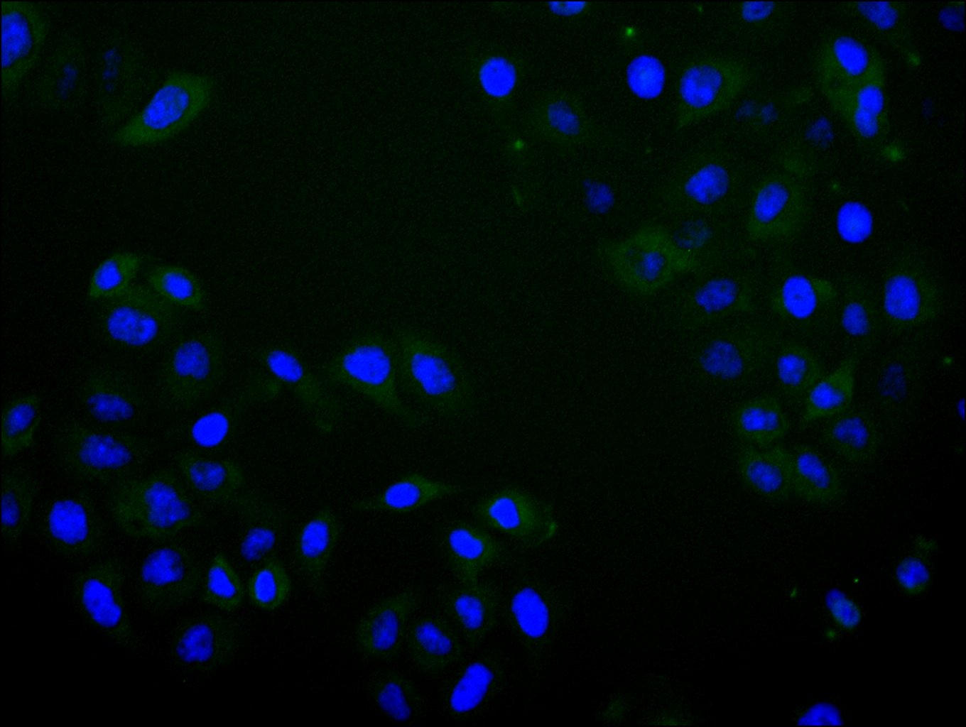 Immunofluorescence staining of MCF-7 cell with CSB-PA025796OA01HU at 1:30, counter-stained with DAPI. The cells were fixed in 4% formaldehyde and blocked in 10% normal Goat Serum. The cells were then incubated with the antibody overnight at 4C. The secondary antibody was Alexa Fluor 488-congugated AffiniPure Goat Anti-Rabbit IgG(H+L).