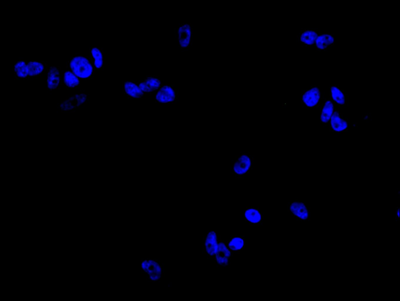 Immunofluorescence staining of Hela cell with 5% goat serum, counter-stained with DAPI. The cells were fixed in 4% formaldehyde and blocked in 10% normal Goat Serum. The cells were then incubated with the antibody overnight at 4C. The secondary antibody was Alexa Fluor 488-congugated AffiniPure Goat Anti-Rabbit IgG(H+L).