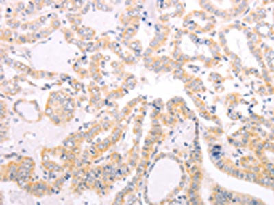 The image on the left is immunohistochemistry of paraffin-embedded Human thyroid cancer tissue using CSB-PA071125(VHL Antibody) at dilution 1/40, on the right is treated with fusion protein. (Original magnification: ×200)