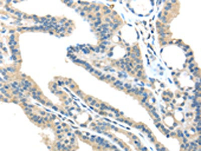 The image on the left is immunohistochemistry of paraffin-embedded Human thyroid cancer tissue using CSB-PA919719(VPS36 Antibody) at dilution 1/40, on the right is treated with synthetic peptide. (Original magnification: ×200)