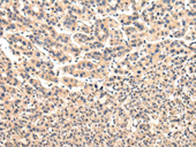 The image on the left is immunohistochemistry of paraffin-embedded Human liver cancer tissue using CSB-PA567081(VPS37A Antibody) at dilution 1/20, on the right is treated with fusion protein. (Original magnification: ×200)