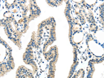 The image on the left is immunohistochemistry of paraffin-embedded Human thyroid cancer tissue using CSB-PA940983(VPS4A Antibody) at dilution 1/25, on the right is treated with synthetic peptide. (Original magnification: ×200)