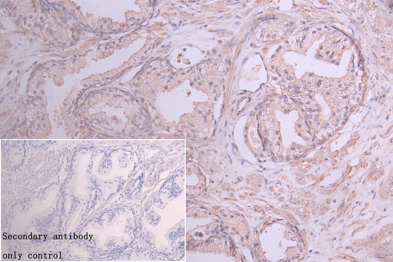 • IHC image of CSB-PA891974DSR2HU diluted at 1:150 and staining in paraffin-embedded human prostatecancer performed on a Leica BondTM system. After dewaxing and hydration, antigen retrieval was mediated by high pressure in a citrate buffer (pH 6.0). Section was blocked with 10% normal goat serum 30min at RT. Then primary antibody (1% BSA) was incubated at 4°C overnight. The primary is detected by a Goat anti-rabbit polymer IgG labeled by HRP and visualized using 0.05% DAB. Secondary antibody only control: uses 1% BSA instead of primary antibody