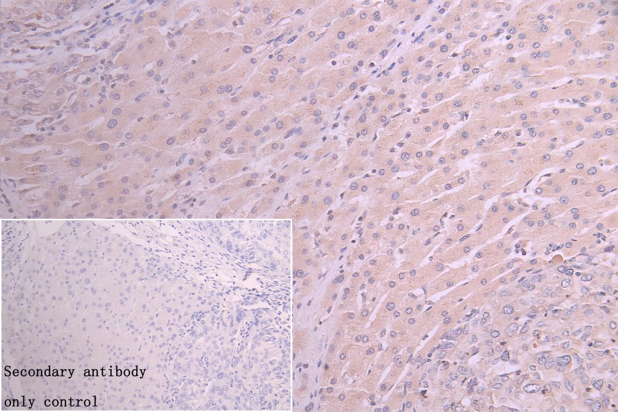 • IHC image of CSB-PA891974DSR2HU diluted at 1:150 and staining in paraffin-embedded human liver cancer performed on a Leica BondTM system. After dewaxing and hydration, antigen retrieval was mediated by high pressure in a citrate buffer (pH 6.0). Section was blocked with 10% normal goat serum 30min at RT. Then primary antibody (1% BSA) was incubated at 4°C overnight. The primary is detected by a Goat anti-rabbit polymer IgG labeled by HRP and visualized using 0.05% DAB. Secondary antibody only control: uses 1% BSA instead of primary antibody