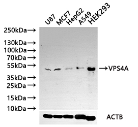The purified VPS4A polyclonal antibody has been characterized by ELISA, WB, and IHC to confirm their specificity and sensitivity to VPS4A. This antibody can react with human, mouse, and rat VPS4A proteins. VPS4A mainly catalyzes the disassembly of ESCRT complexes, which are involved in the sorting and trafficking of membrane proteins in the endocytic pathway. It is also implicated in cytokinesis and virus budding.