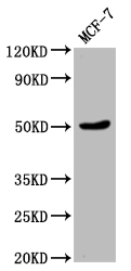 Immunofluorescent analysis of MCF-7 cells using CSB-PA025915LA01HU at dilution of 1:100 and Alexa Fluor 488-congugated AffiniPure Goat Anti-Rabbit IgG(H+L)