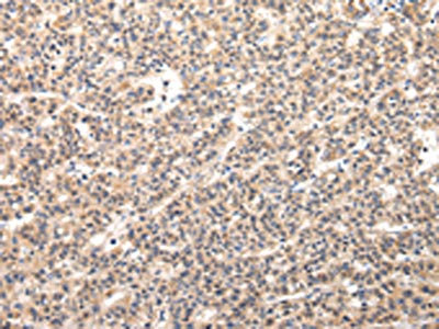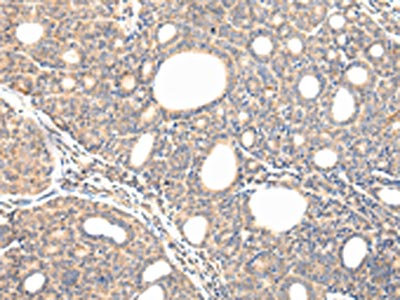 The image on the left is immunohistochemistry of paraffin-embedded Human thyroid cancer tissue using CSB-PA164632(VPS54 Antibody) at dilution 1/30, on the right is treated with fusion protein. (Original magnification: ×200)
