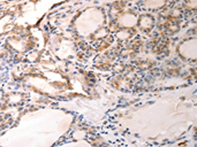 The image on the left is immunohistochemistry of paraffin-embedded Human thyroid cancer tissue using CSB-PA017573(VTCN1 Antibody) at dilution 1/20, on the right is treated with synthetic peptide. (Original magnification: ×200)