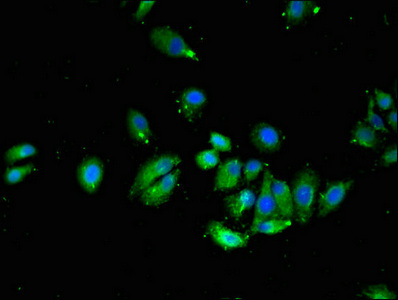 • Immunofluorescent analysis of HepG2 cells using CSB-PA842635LA01HU at dilution of 1:100 and Alexa Fluor 488-congugated AffiniPure Goat Anti-Rabbit IgG(H+L)