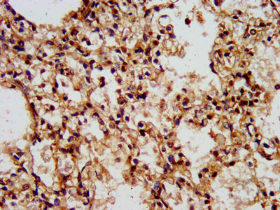 IHC image of CSB-PA896553LA01HU diluted at 1:500 and staining in paraffin-embedded human placenta tissue performed on a Leica BondTM system. After dewaxing and hydration, antigen retrieval was mediated by high pressure in a citrate buffer (pH 6.0). Section was blocked with 10% normal goat serum 30min at RT. Then primary antibody (1% BSA) was incubated at 4°C overnight. The primary is detected by a biotinylated secondary antibody and visualized using an HRP conjugated SP system.
