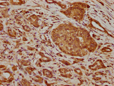 IHC image of CSB-PA879071LA01HU diluted at 1:200 and staining in paraffin-embedded human pancreatic cancer performed on a Leica BondTM system. After dewaxing and hydration, antigen retrieval was mediated by high pressure in a citrate buffer (pH 6.0). Section was blocked with 10% normal goat serum 30min at RT. Then primary antibody (1% BSA) was incubated at 4°C overnight. The primary is detected by a biotinylated secondary antibody and visualized using an HRP conjugated SP system.