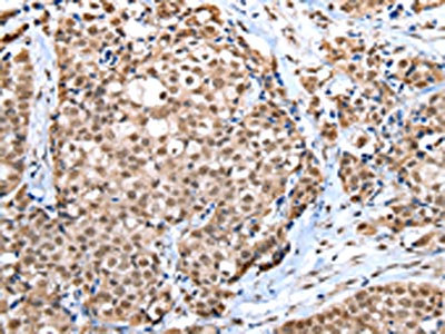 The image on the left is immunohistochemistry of paraffin-embedded Human breast cancer tissue using CSB-PA062933(WDR5 Antibody) at dilution 1/30, on the right is treated with fusion protein. (Original magnification: ×200)