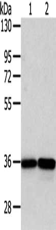 Gel: 8%SDS-PAGE, Lysate: 40 μg, Lane 1-2: PC3 and A375 cell, Primary antibody: CSB-PA062933(WDR5 Antibody) at dilution 1/350 dilution, Secondary antibody: Goat anti rabbit IgG at 1/8000 dilution, Exposure time: 5 seconds