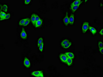 Immunofluorescent analysis of HepG2 cells using CSB-PA818226LA01HU at dilution of 1:100 and Alexa Fluor 488-congugated AffiniPure Goat Anti-Rabbit IgG(H+L)