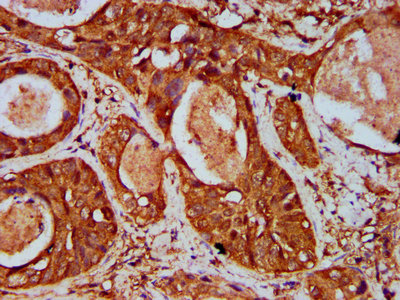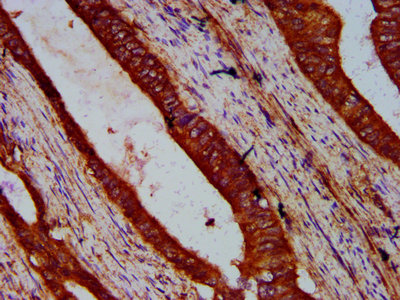 IHC image of CSB-PA823478LA01HU diluted at 1:500 and staining in paraffin-embedded human colon cancer performed on a Leica BondTM system. After dewaxing and hydration, antigen retrieval was mediated by high pressure in a citrate buffer (pH 6.0). Section was blocked with 10% normal goat serum 30min at RT. Then primary antibody (1% BSA) was incubated at 4°C overnight. The primary is detected by a biotinylated secondary antibody and visualized using an HRP conjugated SP system.