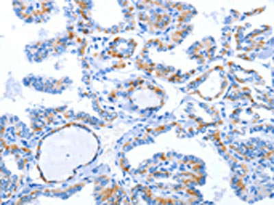 The image on the left is immunohistochemistry of paraffin-embedded Human thyroid cancer tissue using CSB-PA682357(WNT1 Antibody) at dilution 1/50, on the right is treated with synthetic peptide. (Original magnification: ×200)