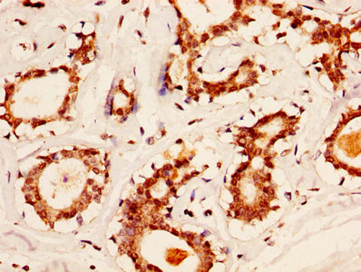 • IHC image of CSB-PA15549A0Rb diluted at 1:260 and staining in paraffin-embedded human breast cancer performed on a Leica BondTM system. After dewaxing and hydration, antigen retrieval was mediated by high pressure in a citrate buffer (pH 6.0). Section was blocked with 10% normal goat serum 30min at RT. Then primary antibody (1% BSA) was incubated at 4°C overnight. The primary is detected by a biotinylated secondary antibody and visualized using an HRP conjugated SP system.