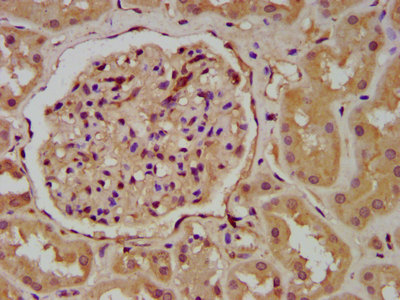 • IHC image of CSB-PA026146LA01HU diluted at 1:200 and staining in paraffin-embedded human kidney tissue performed on a Leica BondTM system. After dewaxing and hydration, antigen retrieval was mediated by high pressure in a citrate buffer (pH 6.0). Section was blocked with 10% normal goat serum 30min at RT. Then primary antibody (1% BSA) was incubated at 4°C overnight. The primary is detected by a biotinylated secondary antibody and visualized using an HRP conjugated SP system.