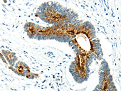 The image on the left is immunohistochemistry of paraffin-embedded Human colorectal cancer tissue using CSB-PA028760(WWOX Antibody) at dilution 1/20, on the right is treated with synthetic peptide. (Original magnification: ×200)