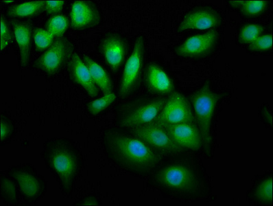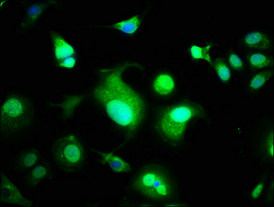 Immunofluorescence staining of A549 cells with CSB-PA873704LA01HU at 1:100, counter-stained with DAPI. The cells were fixed in 4% formaldehyde, permeabilized using 0.2% Triton X-100 and blocked in 10% normal Goat Serum. The cells were then incubated with the antibody overnight at 4°C. The secondary antibody was Alexa Fluor 488-congugated AffiniPure Goat Anti-Rabbit IgG(H+L).