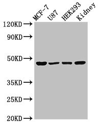 Positive WB detected in: MCF-7 whole cell lysate, U87 whole cell lysate, HEK293 whole cell lysate, Rat kidney tissue