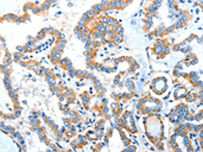 • The image on the left is immunohistochemistry of paraffin-embedded Human thyroid cancer tissue using CSB-PA748751(XBP1 Antibody) at dilution 1/70, on the right is treated with fusion protein. (Original magnification: ×200)