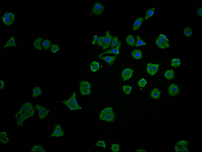 Immunofluorescence staining of HepG2 cells with CSB-PA026244LA11HU at 1:100, counter-stained with DAPI. The cells were fixed in 4% formaldehyde and blocked in 10% normal Goat Serum. The cells were then incubated with the antibody overnight at 4°C. The secondary antibody was Alexa Fluor 488-congugated AffiniPure Goat Anti-Rabbit IgG(H+L).