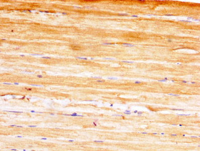 • IHC image of CSB-PA02174A0Rb diluted at 1:400 and staining in paraffin-embedded human skeletal muscle tissue performed on a Leica BondTM system. After dewaxing and hydration, antigen retrieval was mediated by high pressure in a citrate buffer (pH 6.0). Section was blocked with 10% normal goat serum 30min at RT. Then primary antibody (1% BSA) was incubated at 4°C overnight. The primary is detected by a biotinylated secondary antibody and visualized using an HRP conjugated SP system.