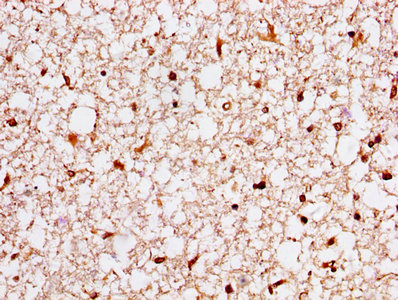 • IHC image of CSB-PA02174A0Rb diluted at 1:400 and staining in paraffin-embedded human brain tissue performed on a Leica BondTM system. After dewaxing and hydration, antigen retrieval was mediated by high pressure in a citrate buffer (pH 6.0). Section was blocked with 10% normal goat serum 30min at RT. Then primary antibody (1% BSA) was incubated at 4°C overnight. The primary is detected by a biotinylated secondary antibody and visualized using an HRP conjugated SP system.