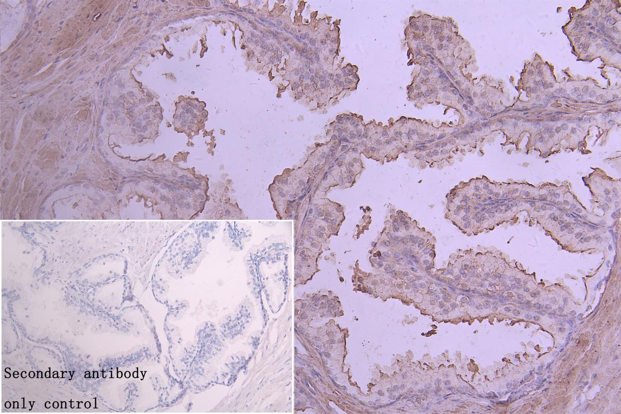 IHC image of CSB-PA822219LA01HU diluted at 1:20 and staining in paraffin-embedded human prostate cancer performed on a Leica BondTM system. After dewaxing and hydration, antigen retrieval was mediated by high pressure in a citrate buffer (pH 6.0). Section was blocked with 10% normal goat serum 30min at RT. Then primary antibody (1% BSA) was incubated at 4°C overnight. The primary is detected by a Goat anti-rabbit polymer IgG labeled by HRP and visualized using 0.05% DAB. Secondary antibody only control: uses 1% BSA instead of primary antibody