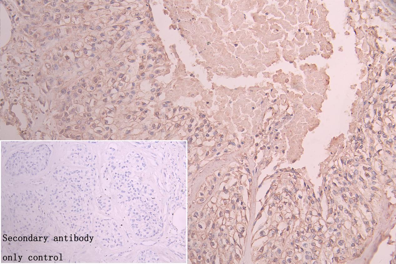 IHC image of CSB-PA873612LA01HU diluted at 1:75 and staining in paraffin-embedded human pancreatic cancer performed on a Leica BondTM system. After dewaxing and hydration, antigen retrieval was mediated by high pressure in a citrate buffer (pH 6.0). Section was blocked with 10% normal goat serum 30min at RT. Then primary antibody (1% BSA) was incubated at 4°C overnight. The primary is detected by a Goat anti-rabbit polymer IgG labeled by HRP and visualized using 0.05% DAB. Secondary antibody only control: uses 1% BSA instead of primary antibody