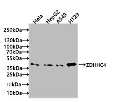 Positive WB detected in: Hela whole cell lysate(20μg), HepG2 whole cell lysate(20μg), A549 whole cell lysate(20μg), HT29 whole cell lysate(20μg)