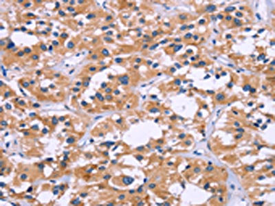 The image on the left is immunohistochemistry of paraffin-embedded Human thyroid cancer tissue using CSB-PA073575(ZEB2 Antibody) at dilution 1/60, on the right is treated with fusion protein. (Original magnification: ×200)