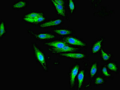 Immunofluorescent analysis of Hela cells using CSB-PA800100ESR2HU at dilution of 1:100 and Alexa Fluor 488-congugated AffiniPure Goat Anti-Rabbit IgG(H+L)