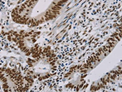The image on the left is immunohistochemistry of paraffin-embedded Human colon cancer tissue using CSB-PA942507(ZMAT3 Antibody) at dilution 1/20, on the right is treated with fusion protein. (Original magnification: ×200)