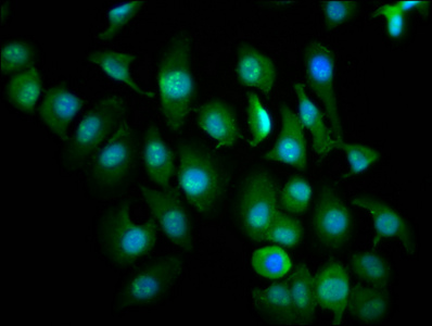 Immunofluorescence staining of A549 cells with CSB-PA890749LA01HU at 1:266, counter-stained with DAPI. The cells were fixed in 4% formaldehyde, permeabilized using 0.2% Triton X-100 and blocked in 10% normal Goat Serum. The cells were then incubated with the antibody overnight at 4°C. The secondary antibody was Alexa Fluor 488-congugated AffiniPure Goat Anti-Rabbit IgG(H+L).