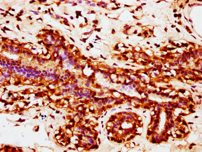 IHC image of CSB-PA026914LA01HU diluted at 1:200 and staining in paraffin-embedded human breast cancer performed on a Leica BondTM system. After dewaxing and hydration, antigen retrieval was mediated by high pressure in a citrate buffer (pH 6.0). Section was blocked with 10% normal goat serum 30min at RT. Then primary antibody (1% BSA) was incubated at 4°C overnight. The primary is detected by a biotinylated secondary antibody and visualized using an HRP conjugated SP system.