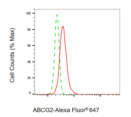• Flow cytometric analysis of ABCG2 expression in HT-1080 cells using ABCG2 antibody. Green, isotype control; red, ABCG2.