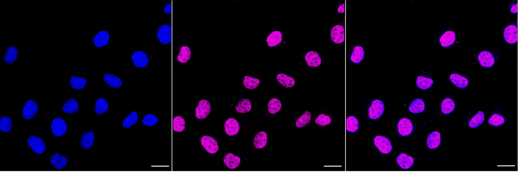 • Immunocytochemical staining of HT-1080 cells with ABCG2 antibody. Nuclei were stained blue with DAPI; ABCG2 was stained magenta with Alexa Fluor? 647. Images were taken using Leica stellaris 5. Protein abundance based on laser Intensity and smart gain: Medium. Scale bar, 20 μm.