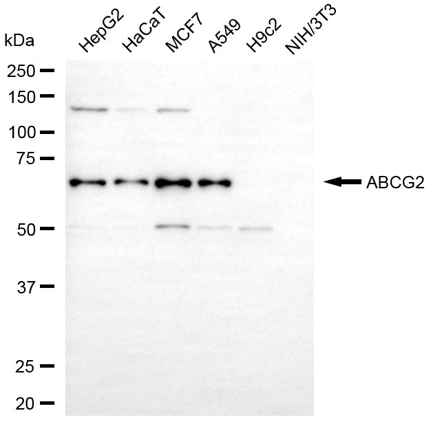 • Western blotting analysis using ABCG2 antibody. Total cell lysates (30 μg) from various cell lines were loaded and separated by SDS-PAGE. The blot was incubated with ABCG2 antibody and HRP-conjugated goat anti-rabbit secondary antibody respectively.