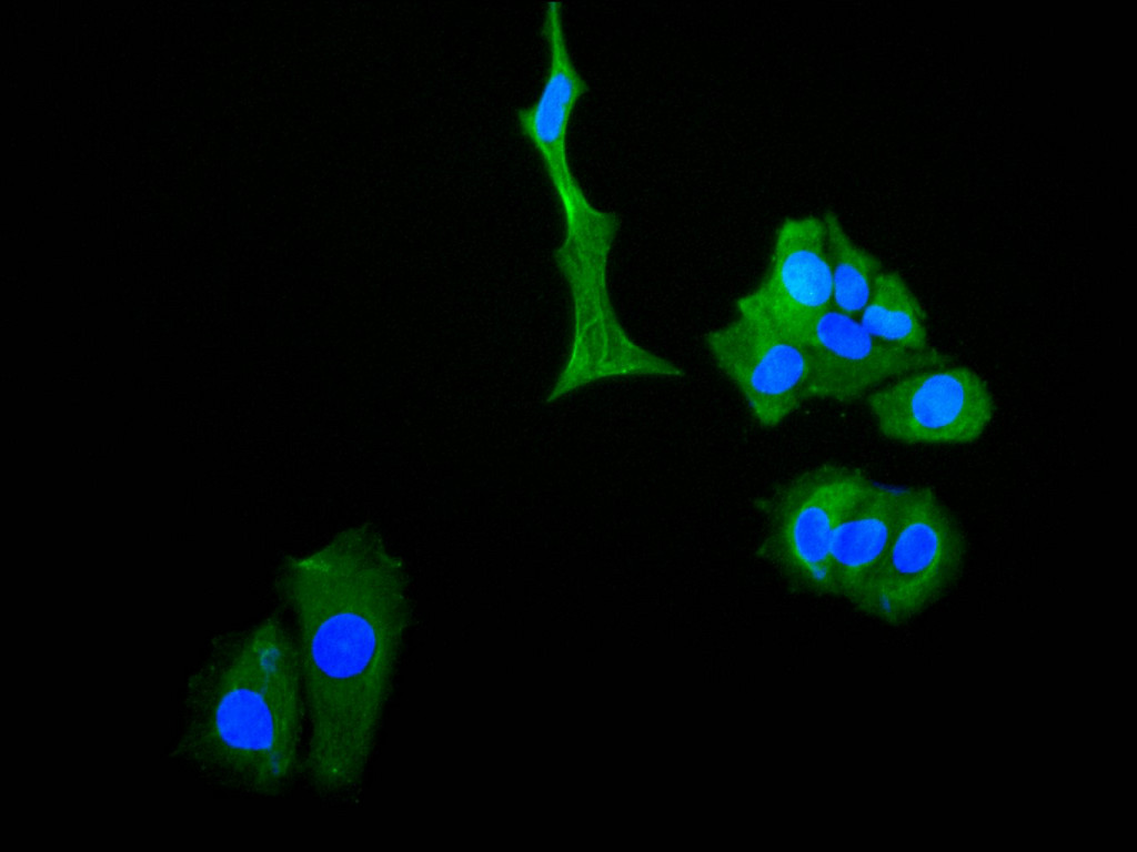 Immunofluorescence staining of MCF-7 cell with CSB-RA582667A0HU at 1:50 , counter-stained with DAPI. The cells were fixed in 4% formaldehyde, permeabilized using 0.2% Triton X-100 and blocked in 10% normal Goat Serum. The cells were then incubated with the antibody overnight at 4°C. The secondary antibody was Alexa Fluor 488-congugated AffiniPure Goat Anti-Rabbit IgG(H+L).