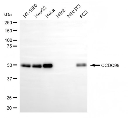 Western blotting analysis using CCDC98 antibody. Total cell lysates (30 μg) from various cell lines were loaded and separated by SDS-PAGE. The blot was incubated with CCDC98 antibody and HRP-conjugated goat anti-rabbit secondary antibody respectively.