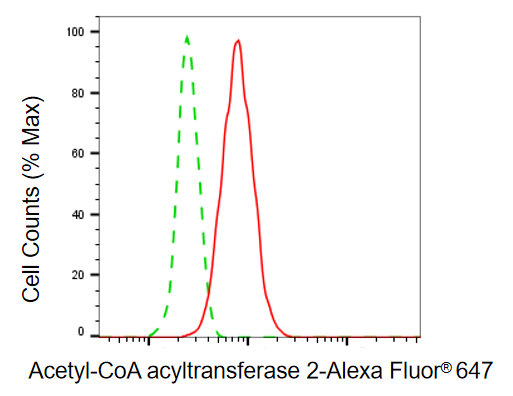 Flow cytometric analysis of acetyl-CoA acyltransferase 2 expression in C2C12 cells using acetyl-CoA acyltransferase 2 antibody. Green, isotype control; red, acetyl-CoA acyltransferase 2.