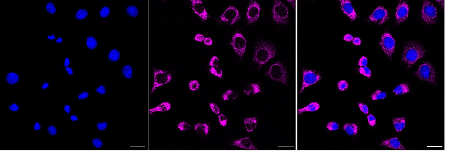 Immunocytochemical staining of C2C12 cells with Acetyl-CoA acyltransferase 2 antibody. Nuclei were stained blue with DAPI; Acetyl-CoA acyltransferase 2 was stained magenta with Alexa Fluor? 647. Images were taken using Leica stellaris 5. Protein abundance based on laser Intensity and smart gain: High. Scale bar, 20 μm.