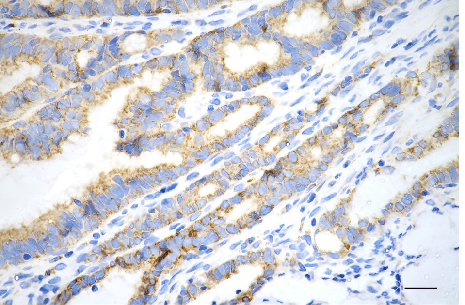 mmunohistochemistry was performed on paraffin-embedded human sigmoid colon carcinoma using acetyl-CoA acyltransferase 2 antibody. Antigen retrieval was done in sodium citrate buffer (pH 6.0). DAB was used for detection, with hematoxylin counterstaining. Images were acquired using a Nikon Ci-L Plus microscope (40× objective). Scale bar: 25 μm.