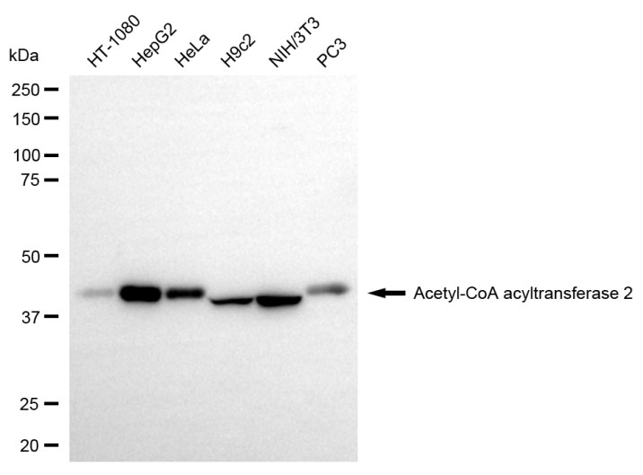 Western blotting analysis using acetyl-CoA acyltransferase 2 antibody. Total cell lysates (30 μg) from various cell lines were loaded and separated by SDS-PAGE. The blot was incubated with acetyl-CoA acyltransferase 2 antibody and HRP-conjugated goat anti-rabbit secondary antibody respectively.